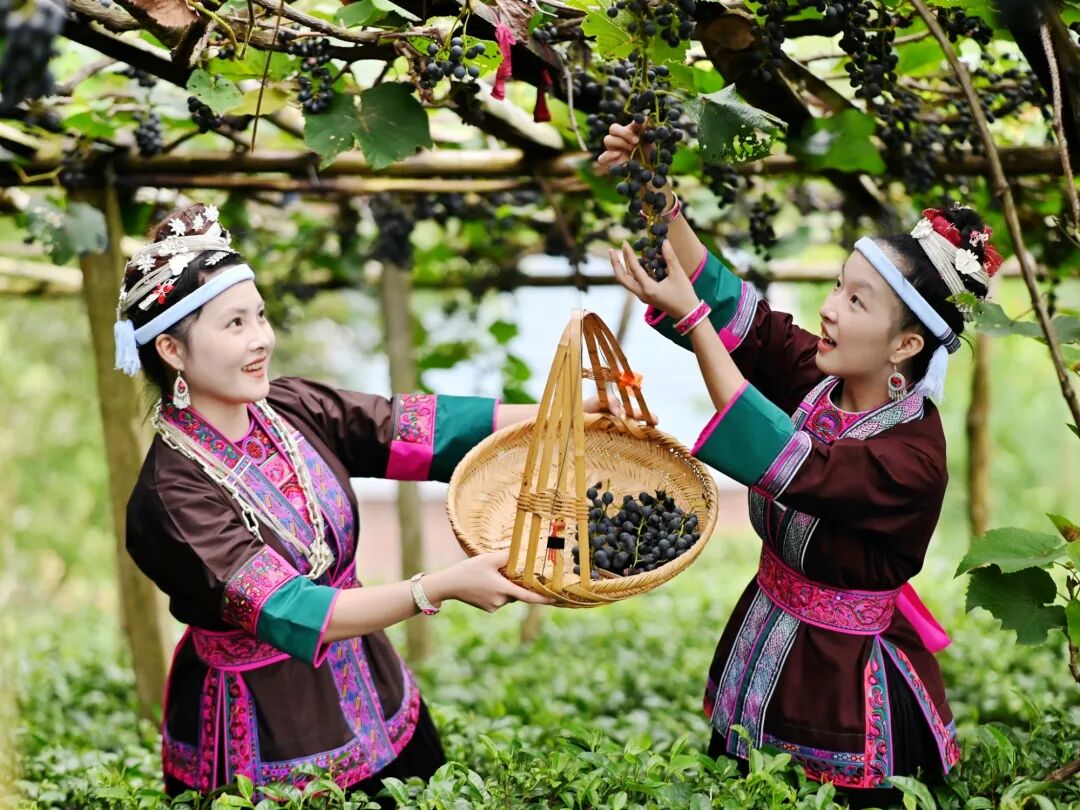 广西三江侗族自治县同乐苗族乡归东村野生葡萄迎来丰收季,苗族、侗族姑娘穿梭藤架下采摘葡萄。(摄影:兰堃)