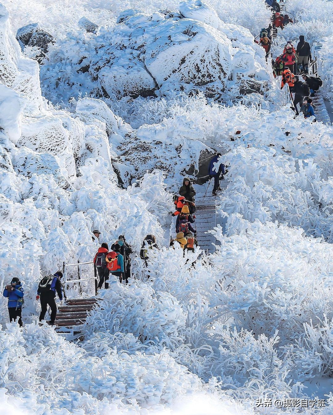 照片当中有很多人,什么情况下能把这些很多人拍到,并且让照片不乱呢?满足两个条件,人在一条线上,另外,除了人以外,色彩比较统一。比如这个登山的画面,人都在台阶上,五颜六色的,周围都是雪和霜,拍出来之后,照片简约又有故事感。