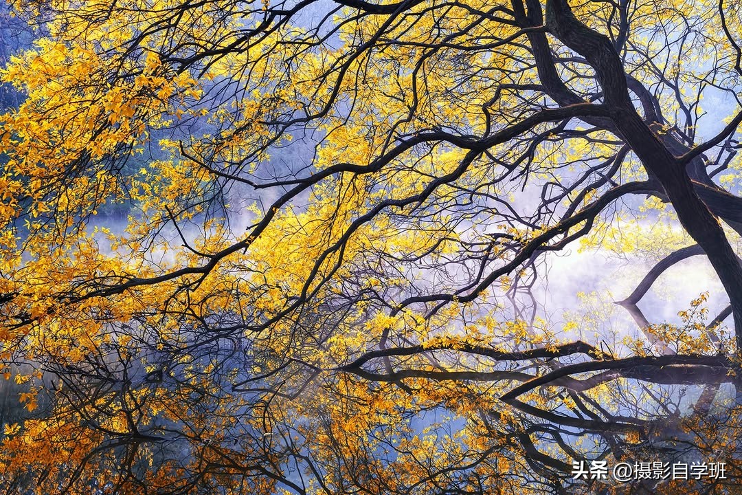 很多树枝看起来很乱,那应该怎么办呢?要注意缩小取景范围,让背景的颜色尽量少,控制在两个以内,比如全是雾气,树叶是黄色,那这很多枝条,就会像线条画在画纸上一样,照片的艺术感就来了。