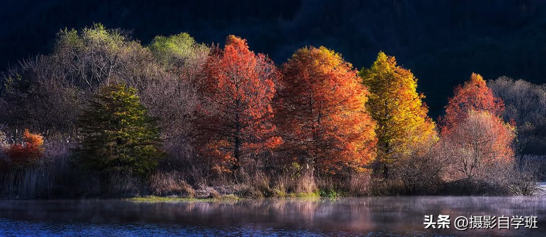 等待,在摄影当中相当重要,等待什么呢?可以等人、等车、等动态景物出现在你的画面当中,但是在摄影中,最主要的就是光线,等待光线从右侧照到树上,树就有明有暗,暗色背景下,被光照亮的树,让照片看起来更加通透!