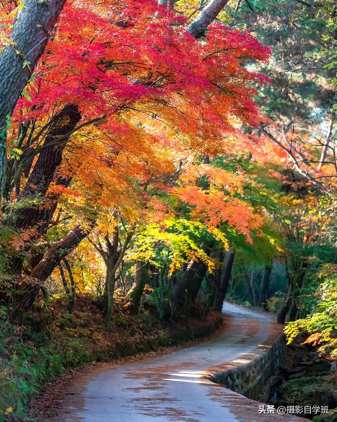 方向在摄影当中很重要,因为一个时间段内,光的方向是不变的,所以你调整拍摄方向,相对的就是改变了光的方向。说人话,就是逆光拍摄更好看,尤其是拍摄树叶,比如这条路左上角,有红色、黄色、绿色的树叶,因为逆光,让照片更有质感。