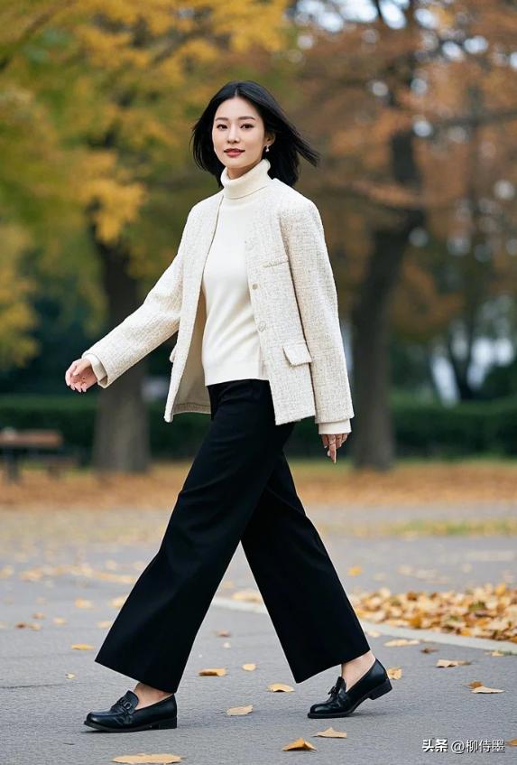走直线的话,双脚一前一后。拍照角度稍微粗一点,就能拍出双腿交叉的效果。