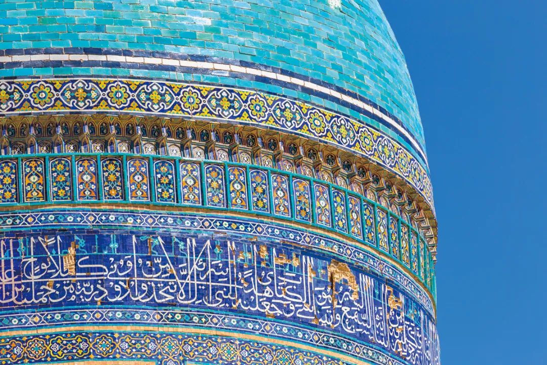 位于乌兹别克斯坦布哈拉的米里-阿拉布神学院的圆顶上镶嵌着精美华丽的陶瓷图案