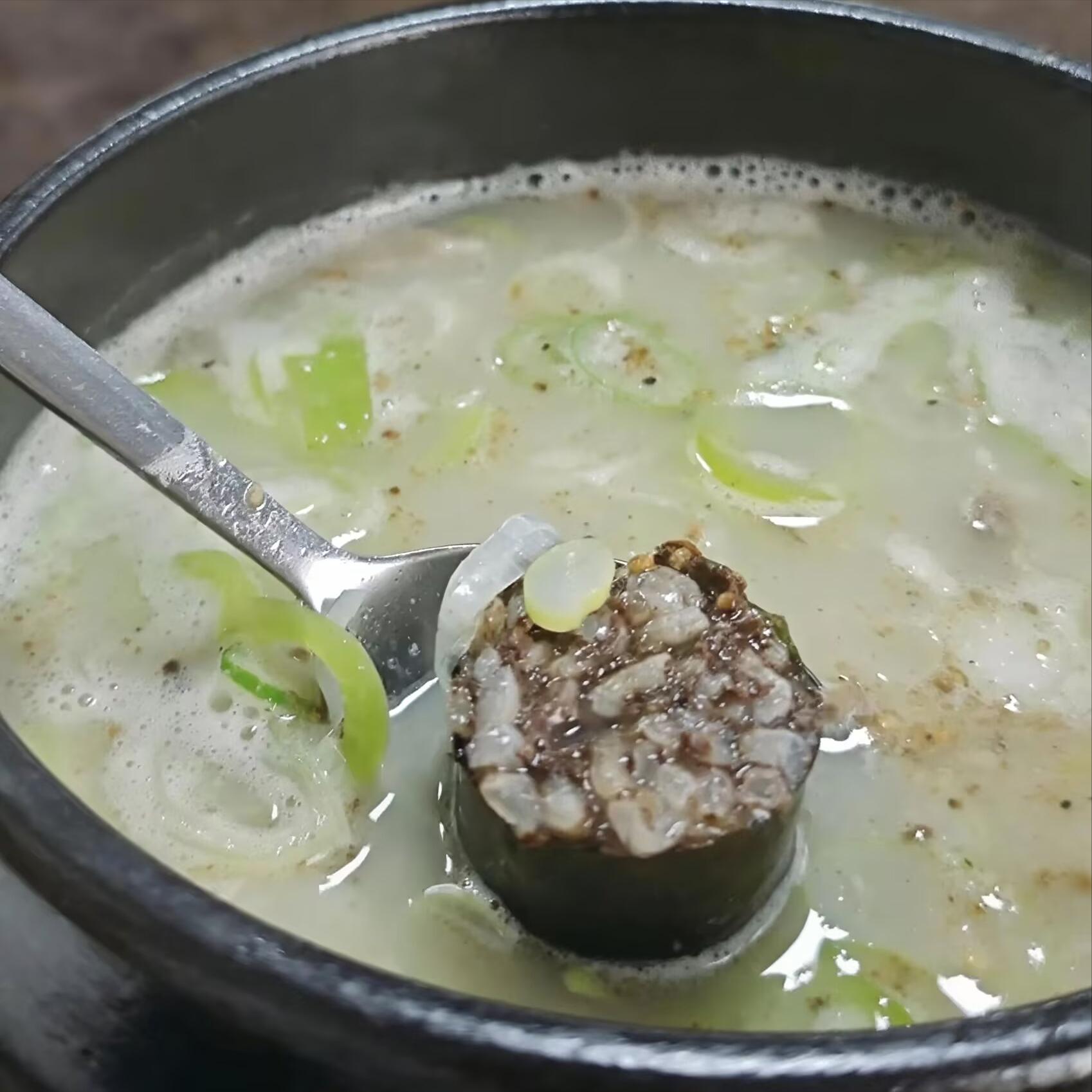 米肠汤饭是招牌,汤色清亮,吊得清鲜,里面放了些猪心猪肺之类的。