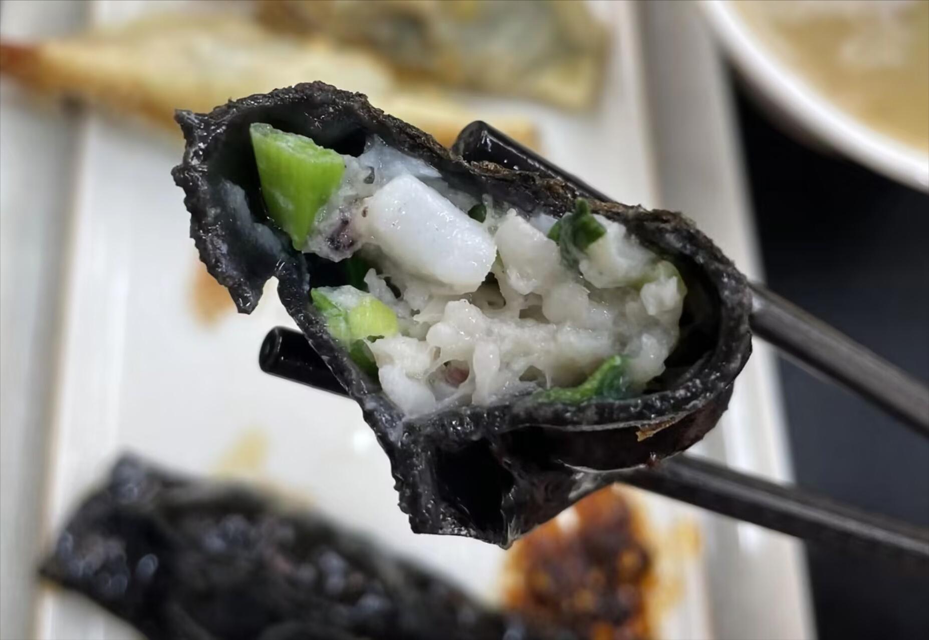 墨鱼锅贴黑漆麻乌的,因为面皮是用墨斗鱼汁子揉的,里面是墨鱼韭菜馅,能吃出海货特有的咸鲜。