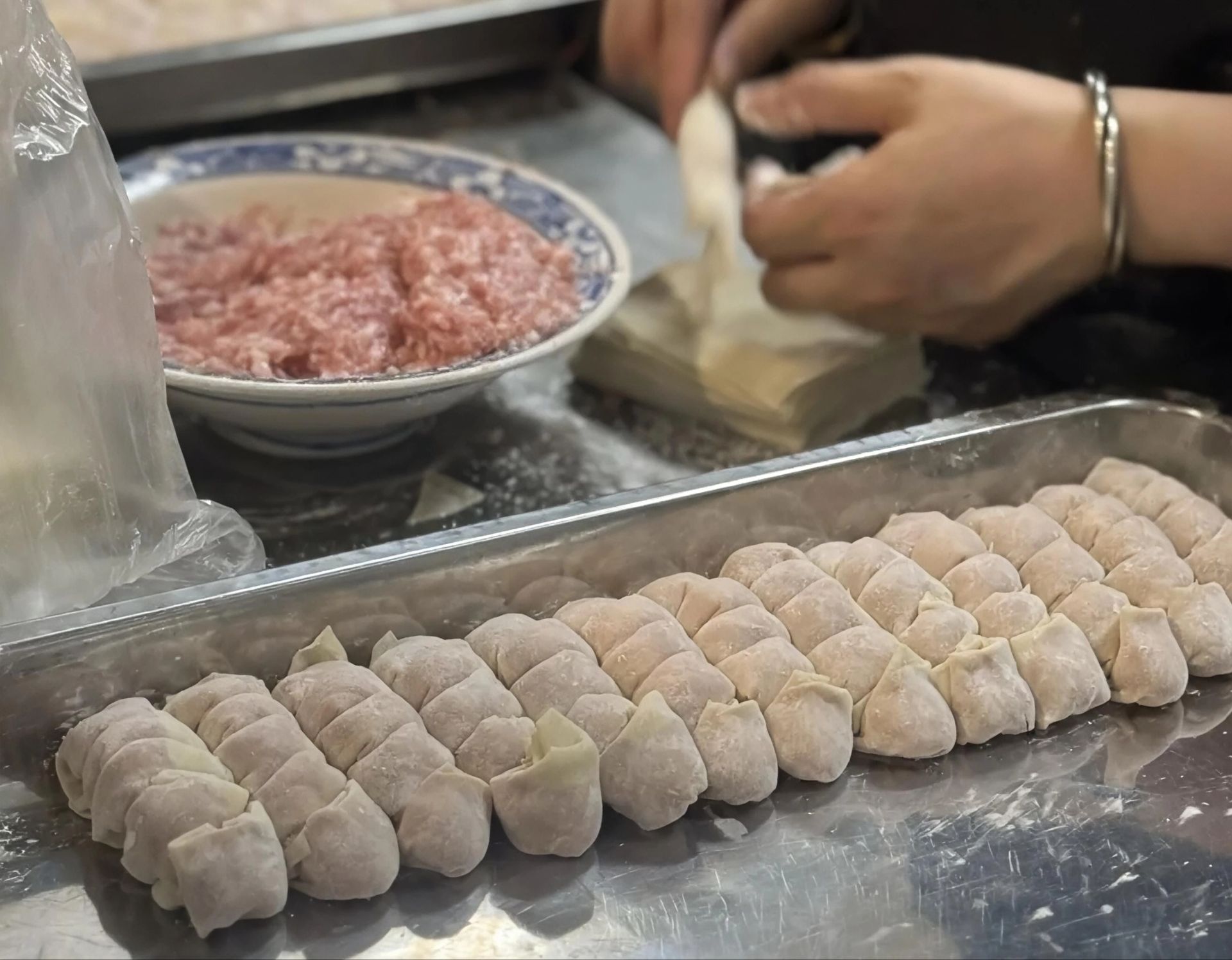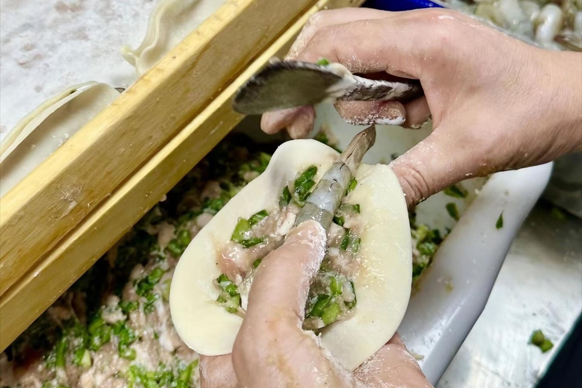 主打的大虾水饺要现点现包,每个面皮里塞两粒虾仁,咬开时汁水四溢。