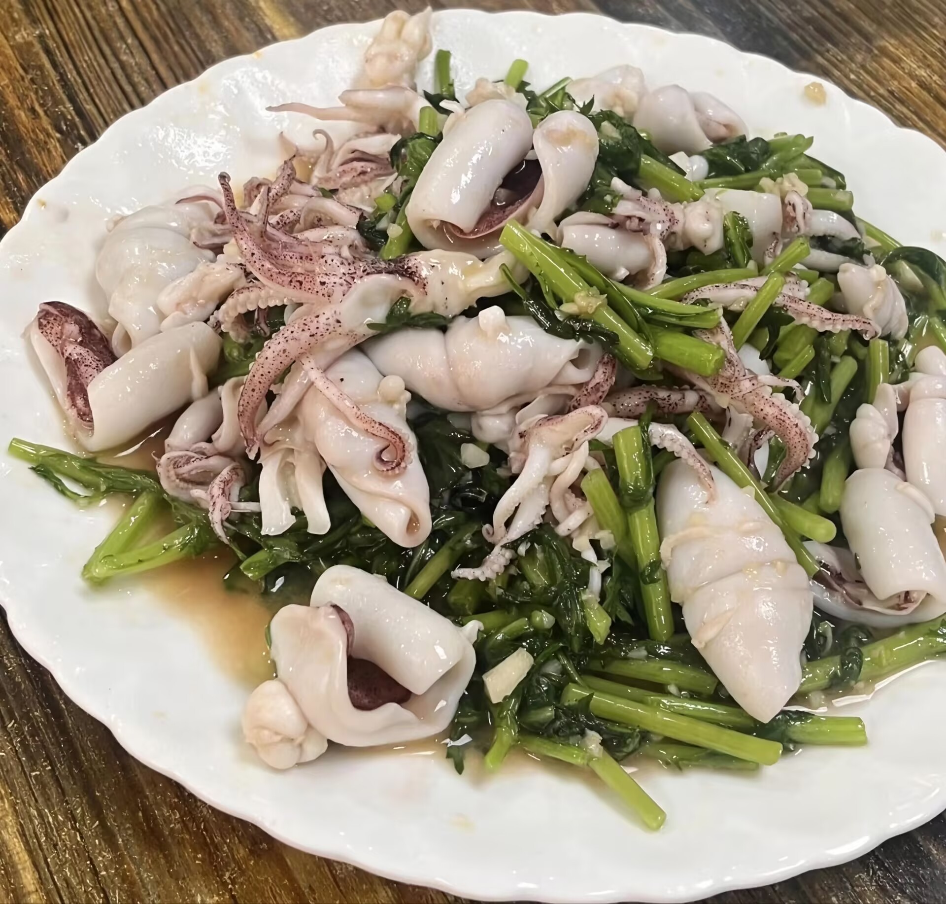 笔管炒茼蒿,58元一份,也是必点的,所谓“笔管”,就是那种细长的墨斗鱼,青岛人叫它海兔子。