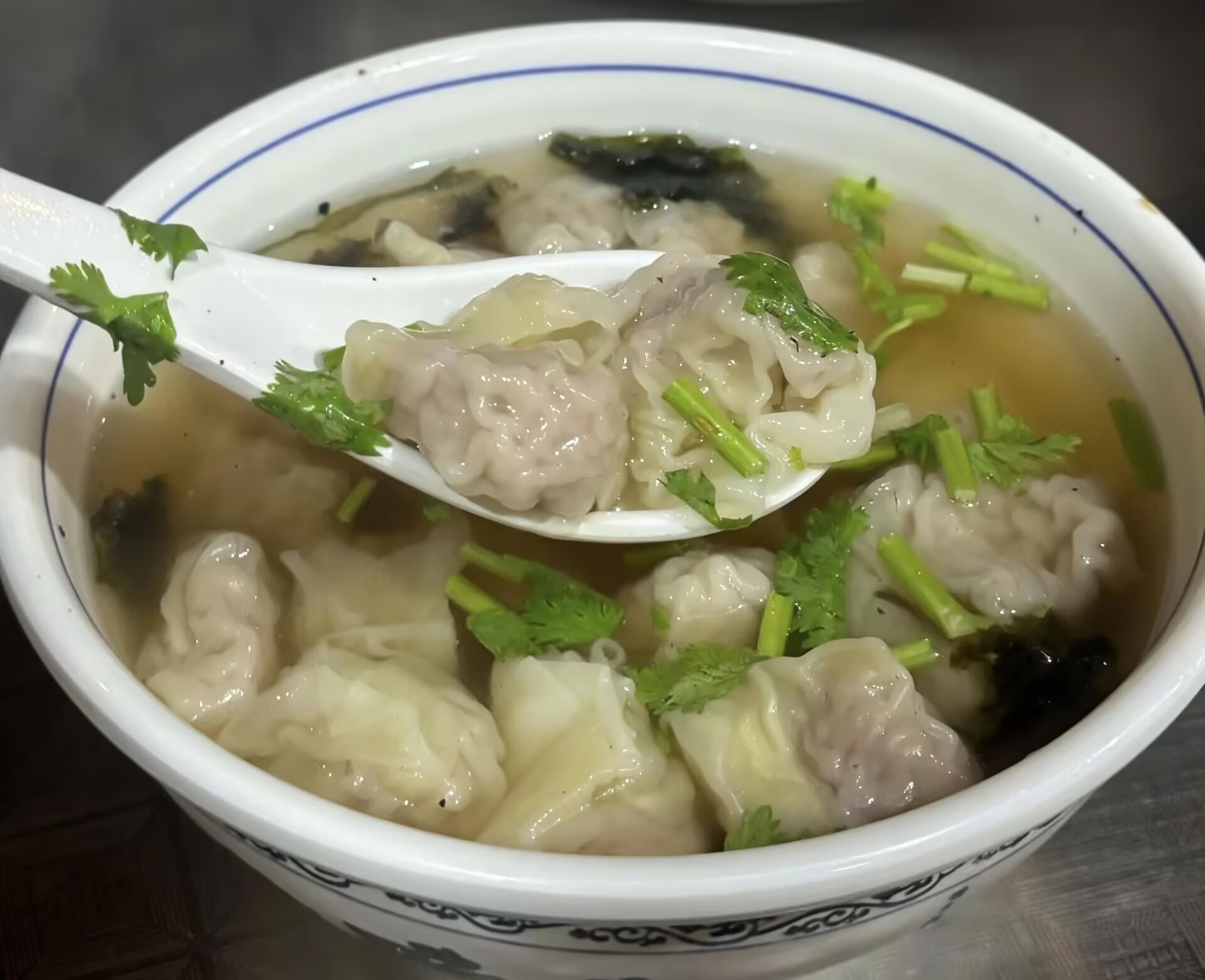 汤里有浓浓的胡椒味,这时候南京人会默契地摸向辣油罐了,味道就更像南京的柴火小馄饨了。