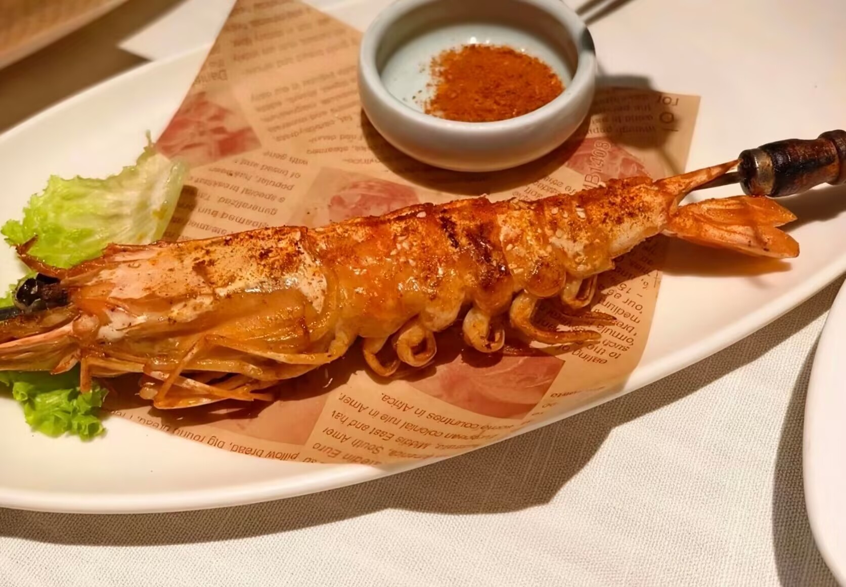 韭菜不过点缀,可以更衬得虾鲜汁浓,店里的烤大虾也还可以,大火燎得虾壳酥脆,虾肉紧实,挺好吃。