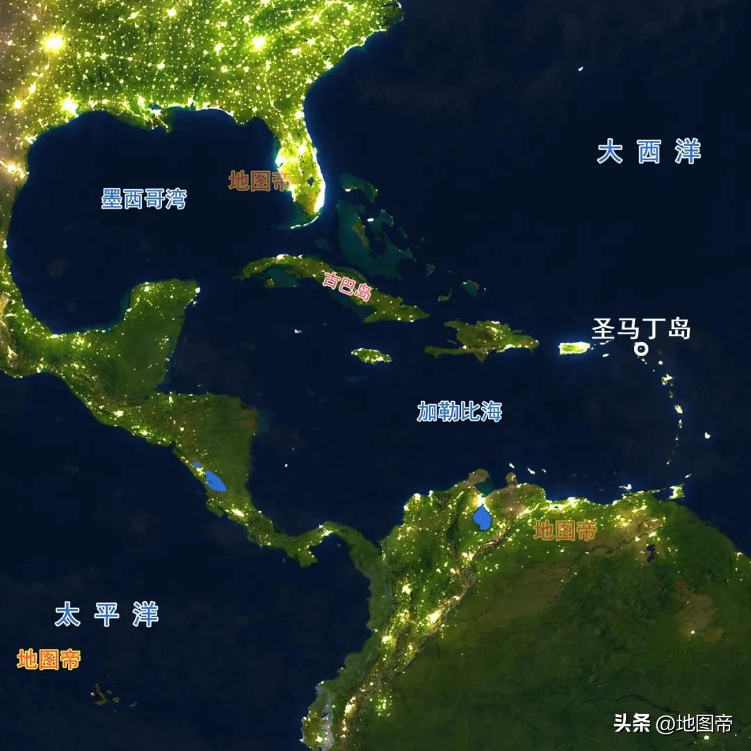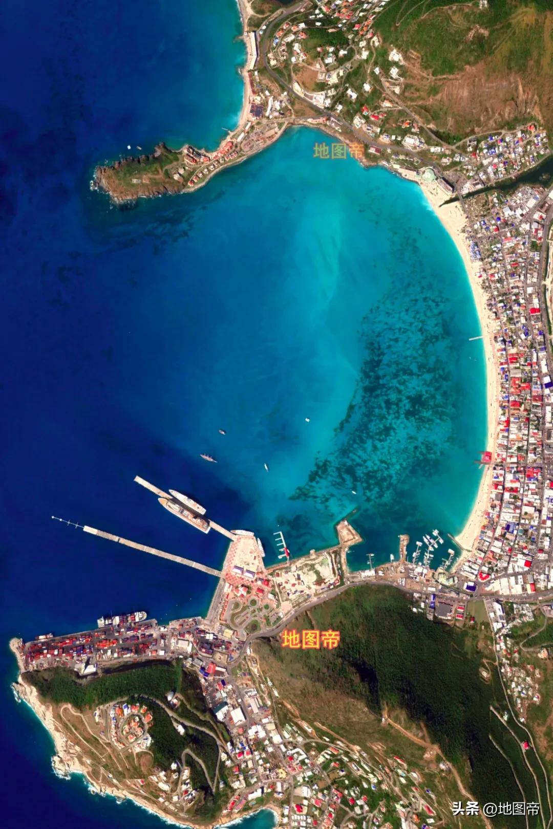 法国占圣马丁岛北部,面积约54平方千米;荷兰占圣马丁岛南部,面积约34平方千米。