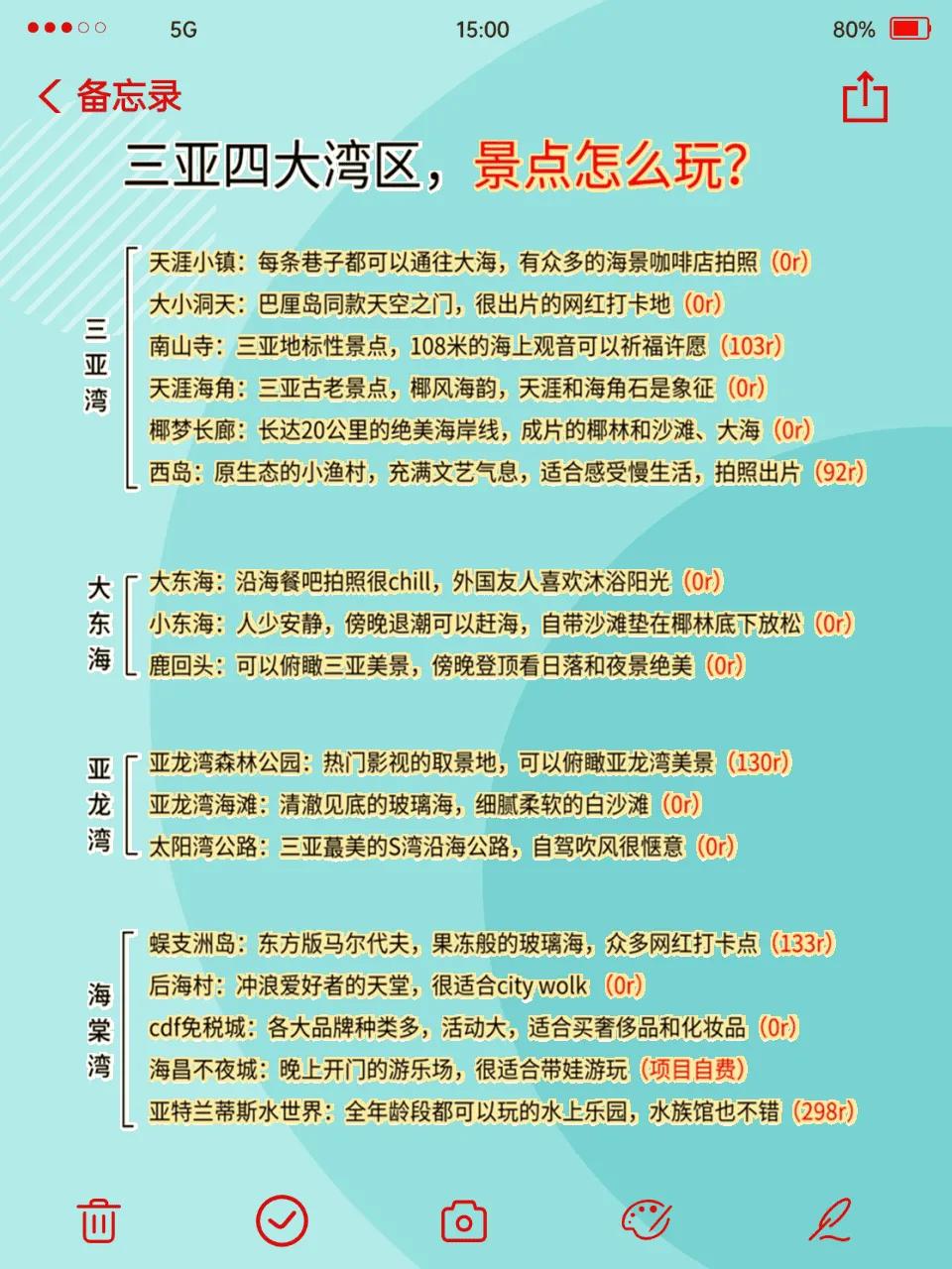 特别提醒:三亚景点比较分散,不要想着一天跑好几个地方,慢慢享受海岛时光才是正确的打开方式。南山文化景区可以免费请香,不要相信那些收费的"通道"。椰梦长廊有野生摄影师,想拍照先看看样片再决定。