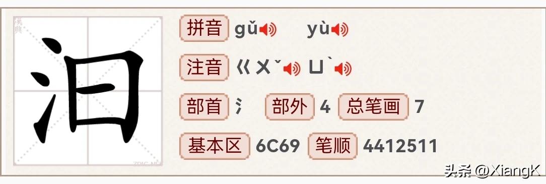 “汩”这个字有两个读音,它的第一个读音是“gǔ”同音字“古”,本意是治水疏通,还有水流的样子。例如鼓流急流的意思。鼓鼓,水流动的声音。以及涌出的泉水,沉没等意思。这个字的第二个读音读作“yù”同音字“愈”。是形容词迅疾的样子。