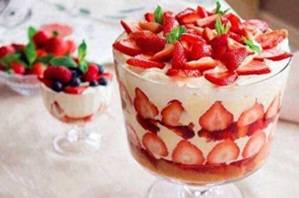 9、英式查佛:查佛是英国的传统甜品,由水果、蛋糕和饼干制成,奶油一层层的叠加,内里是用雪利酒淋泡过的蛋糕,果香酒香在舌尖完美绽放。