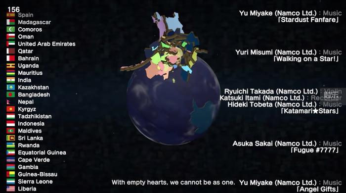通关之后,你可以伴随着Staff名单在整个地球上前进,用“Katamari”粘起所有的国家和地区