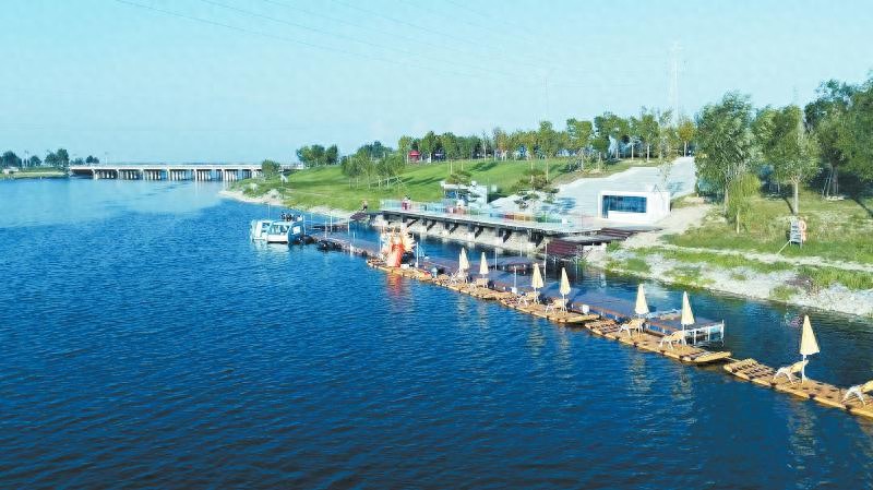 图为共渠生态长廊龙渠韵码头整装待发的百米龙舟和丰富的水上运动项目。新乡日报全媒体记者张延摄