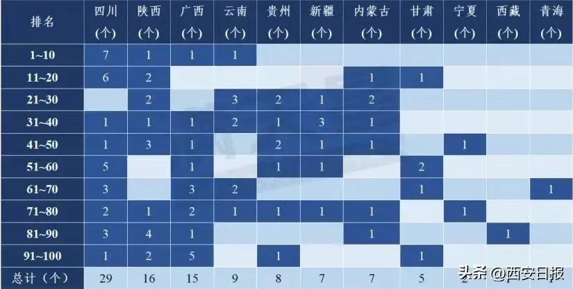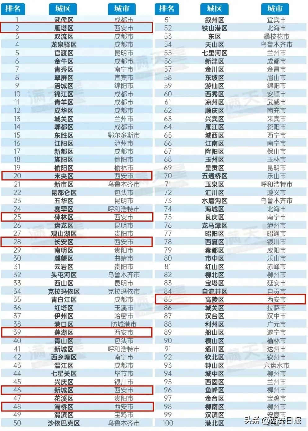 研究指出,四川、陕西和广西表现突出,2024年西部百强区分别占29席、16席和15席。除四川城区外,西部百强区前10名中,陕西、云南、广西各占1席,其中西安雁塔区排名第2。
