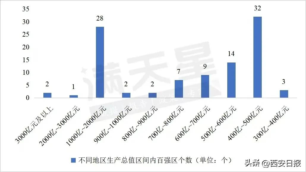 小布通过梳理发现,西部百强区地区生产总值跨度在300亿—4000亿元,数量最多的300亿—600亿元地区生产总值区间城区个数为49个,其次是地区生产总值超1000亿元的城区,其个数为31个;其中成都武侯区和西安雁塔区远超其他百强区,二者的地区生产总值均突破3000亿元。