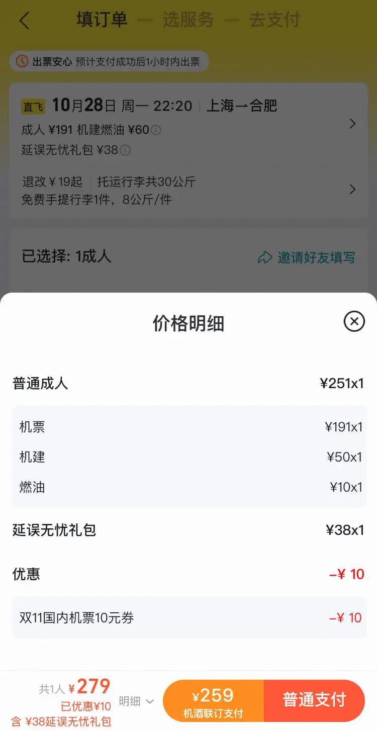 比如上海去合肥,出票价格290元,但这其中有58元是平台自带的延误礼包,不用的话可以退掉,也就是232元,跟高铁200多元的价格已经不相上下了,有出差需求的可以看看,飞行时间也不占用工作时间。