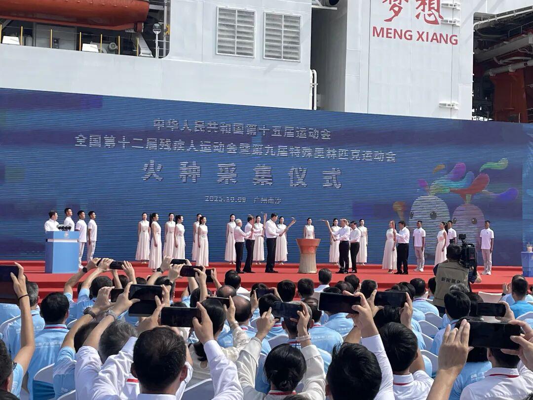 2025年10月9日上午,位于广州市南沙区的广州海洋地质调查局科考码头气氛热烈。在“梦想”号大洋钻探船的见证下,第十五届全国运动会和全国第十二届残疾人运动会暨第九届特殊奥林匹克运动会火种采集仪式举行。