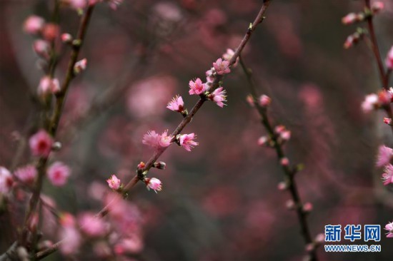 3月1日在山东省临沂市郯城县郯城街道十里村油桃大棚内拍摄的桃花。早春时节,山东省临沂市郯城县的油桃大棚内桃花朵朵开,春意浓浓。新华社发(张春雷 摄)