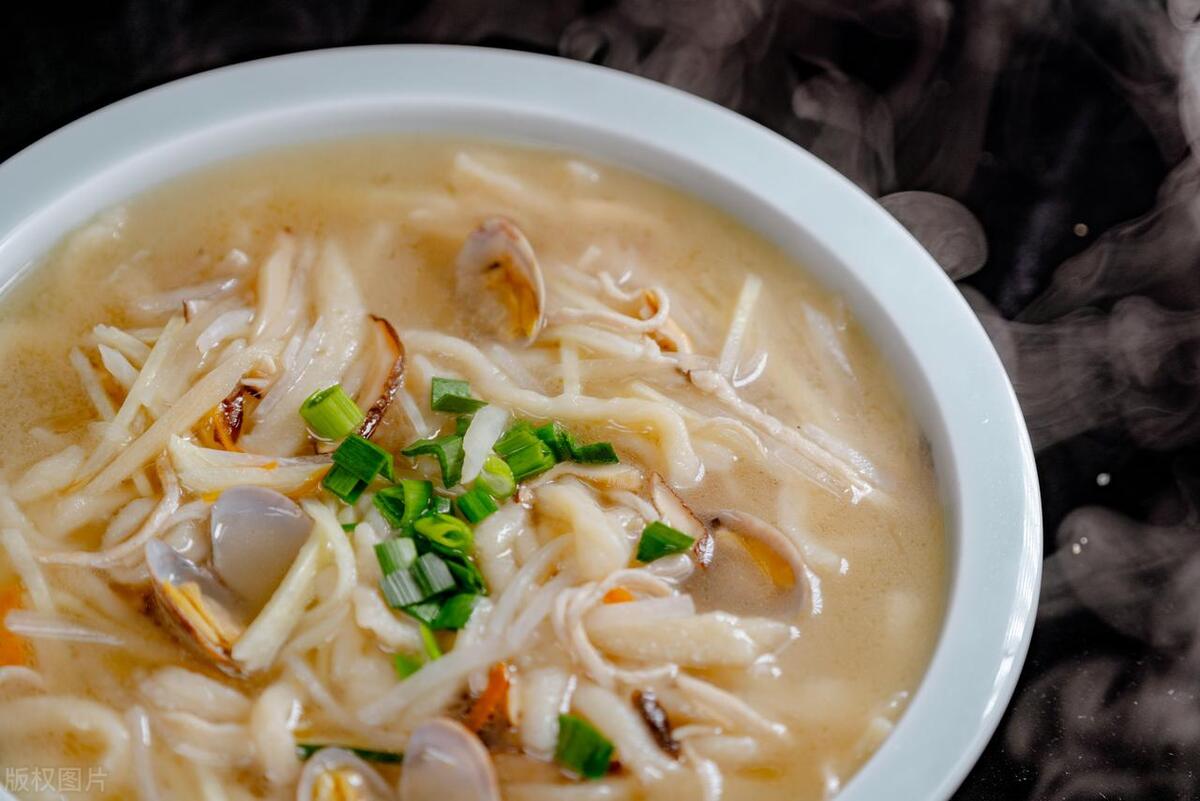 面食狂想:麦粉糊刮成“虾”状入汤,配海鲜、萝卜丝,临海紫阳古街老店灶火不息。