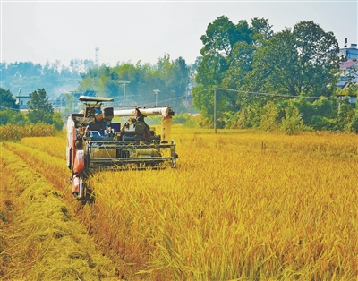10月12日,在安徽省安庆市岳西县温泉镇,农机手驾驶收割机收割水稻。吴均奇摄(影像中国)