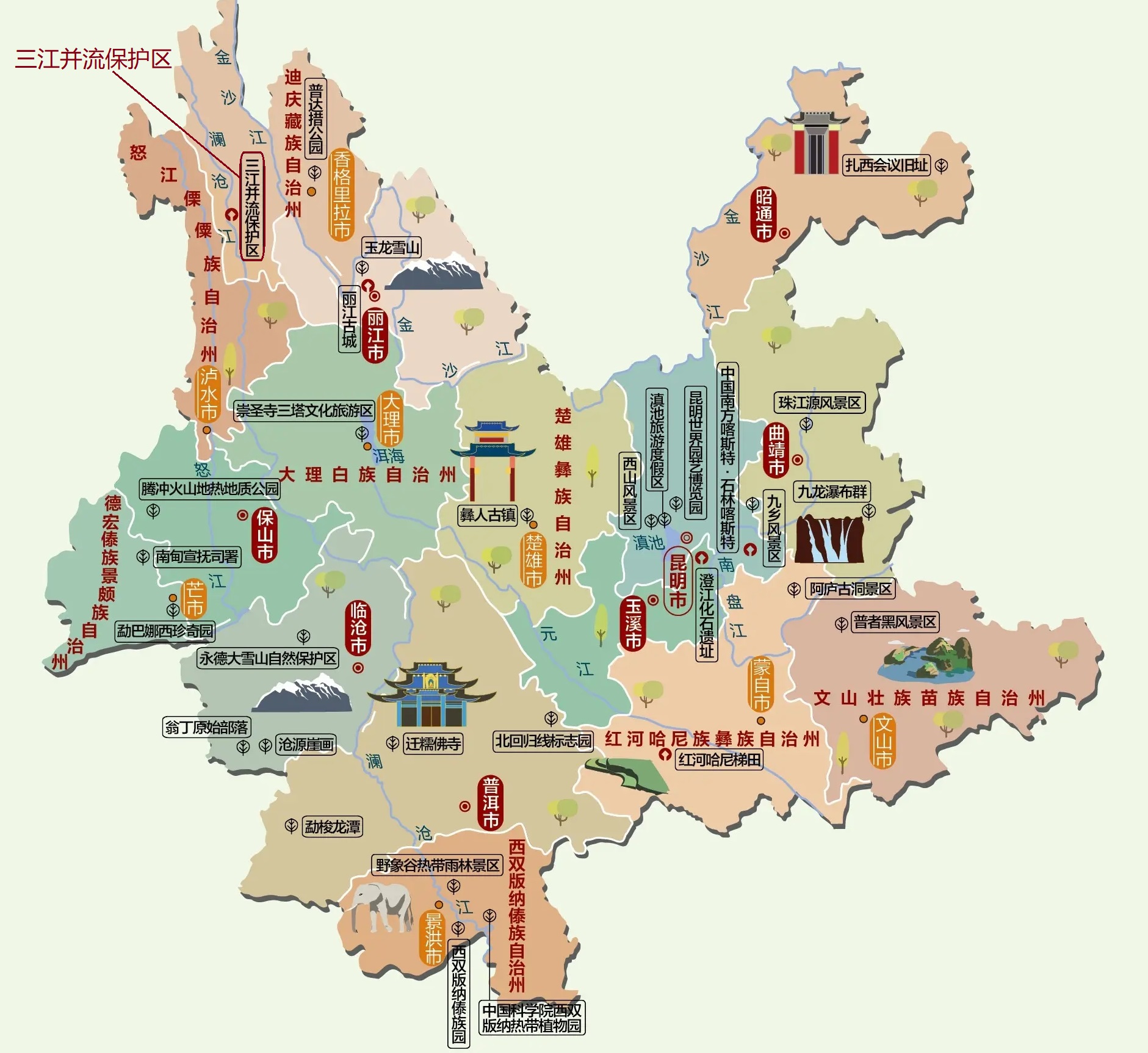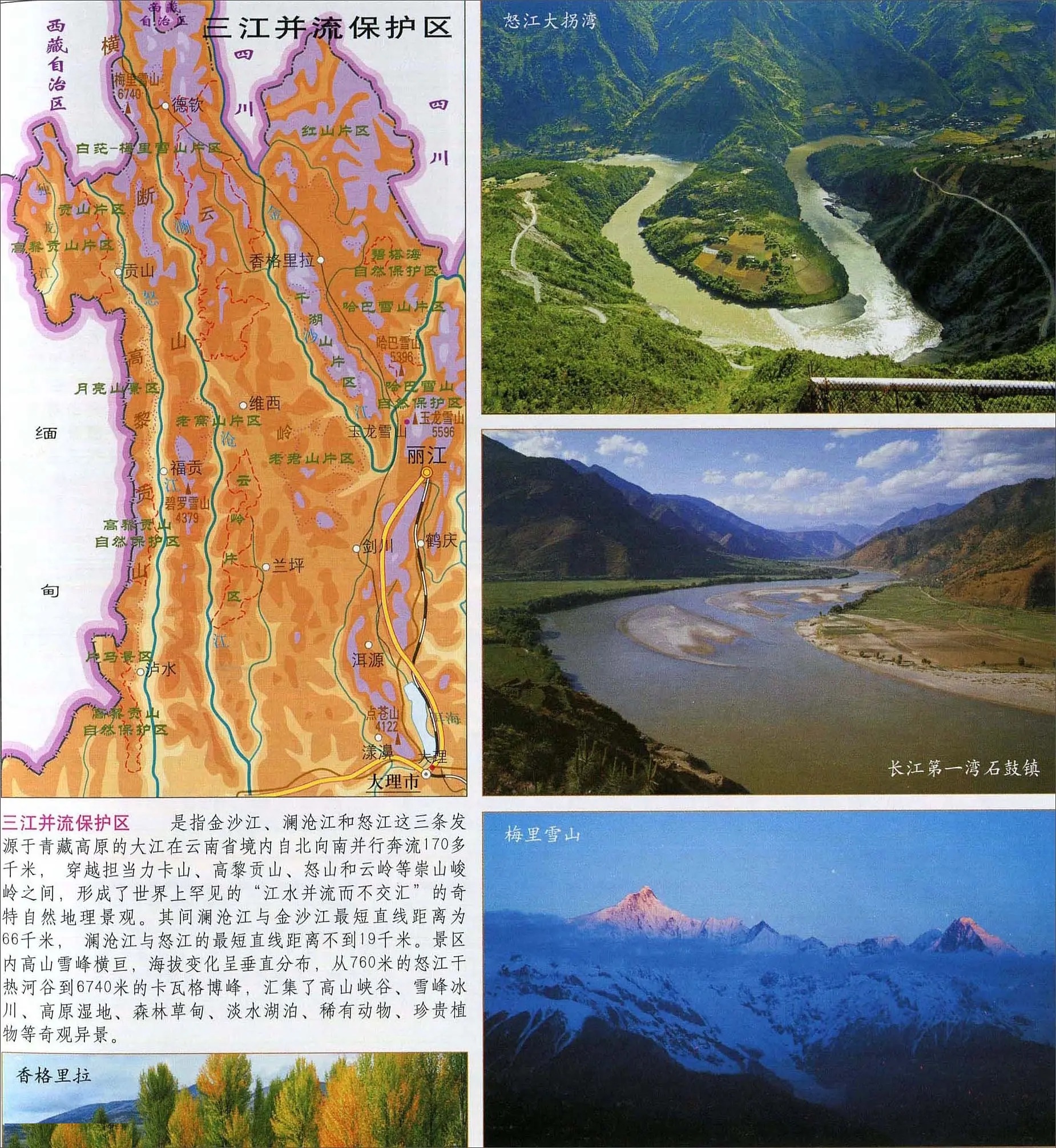 “三江并流”地区位于我国的西南地区,位于云南省西部的横断山区,金沙江、澜沧江和怒江这三条大江,在云南省境内自北向南并行奔流了170多千米,形成了降水并流而不交汇的独特景观。三江并流核心区总面积约为一万平方千米,澜沧江与金沙江最短直线距离为66千米,澜沧江与怒江的最短直线距离不到19千米。