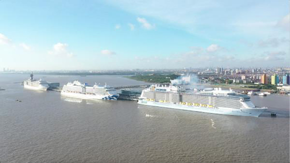 图片说明:2019年8月12日,三艘豪华邮轮今天同时靠泊吴淞口国际邮轮港。