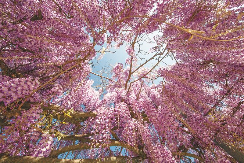 自古以来紫藤多作棚架观赏花卉,栽植在庭院或公园。北京纪晓岚故居有一株260多年紫藤,至今依然枝蔓盘绕,花开时节香气弥漫。北京中山公园、北京植物园、颐和园、红螺寺、恭王府、国子监等诸多景点,都有紫藤,花开时节灿若云霞,为京城花团锦簇增添了紫色情趣。上海市紫藤景点多且很有名。上海市紫藤主题园栽植各类紫藤2500米,是目前国内最长紫藤长廊,壮观的紫藤花长廊格外引人瞩目。嘉定紫藤园有紫藤90多株,品种各异,花开时节艳丽无比。闵行古藤园有一棵470多年紫藤,树形虬曲,躯干粗壮苍劲,每年4月开花,吸引众多游客赏古藤。江苏省多处紫藤非常古老。江阴市中山公园6株“古紫藤”,已有1061年树龄。苏州博物馆忠王府内紫藤,相传为文徵明栽植,距今已近500年历史。此外,无锡市蠡园渔庄、荣氏梅园,都有上百年历史的紫藤。浙江省杭州市余杭区紫藤路有一段紫藤廊道,花开时节长长的紫色花穗垂悬,风起花穗飞舞像紫色飞瀑。山东省费县大田庄乡周家庄村每家都栽紫藤和桂花树,成为远近闻名的美丽乡村,周家庄村以“家家紫藤花开,户户桂树飘香”的独特景致,吸引众多游客春来赏紫藤、秋天闻桂香,成为乡村旅游的范例。我国台湾地区新北市淡水区的紫藤咖啡园,被誉为台湾地区最美紫藤花廊,紫藤花攀附在廊道上,形成绝美的紫色隧道,紫色花瓣如雨落下,浪漫梦幻宛如仙境。此外,在安徽、江西、湖南、广西等诸多省区,这样的紫藤花景致还有很多。舌尖品尝紫藤味