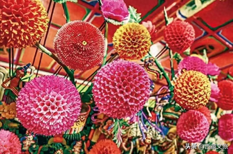 在那一天,拉萨八廓街四周摆满了精美的酥油花,由西藏各地民众用本地盛产的酥油和藏式颜料精心制作。