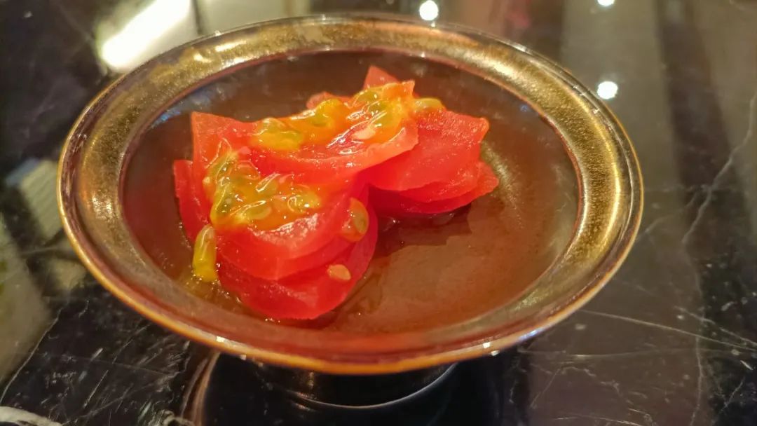 前菜,百香果渍,乍一看好像是西红柿,实际上主要是百香果,这个前菜非常酸爽,很开胃。