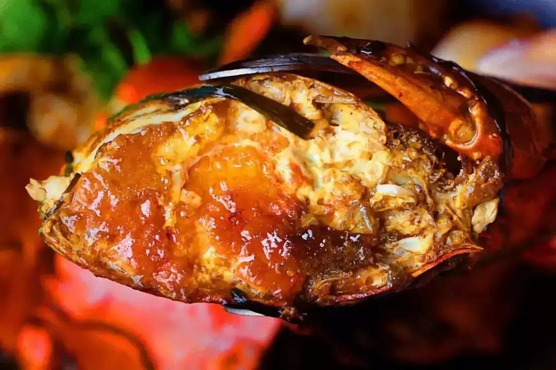 火候刚好的煎蟹出锅时蟹壳油光发亮,