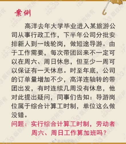 【公司实行综合工时制,双休日工作算加班吗?】劳动保障公司实行综合计算工时制,如果周六周日也正常上班的话,算加班吗?来看市人社局的案例分析 提醒:延长工作时间的小时数平均每月不得超过36小时哦!