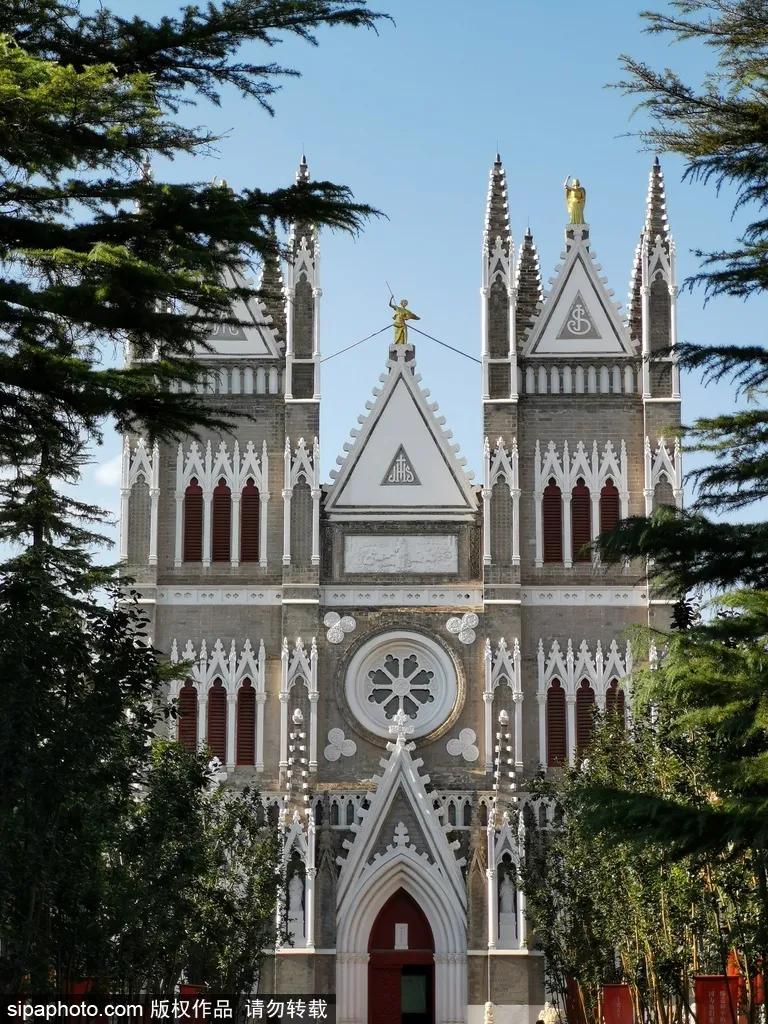 北堂是典型的哥特式建筑。它的四个高高的尖塔,三个尖拱券入口及主跨正中圆形的玫瑰花窗,塑造出端庄而绮丽的立面,在青松翠柏环绕之中越发显得洁白挺拔,整体建筑非常美丽。