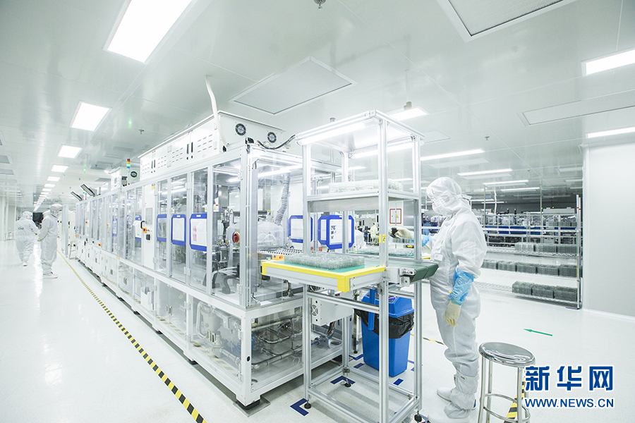 赫得纳米科技黄石公司生产车间内,工人对产品进行检测。新华网发