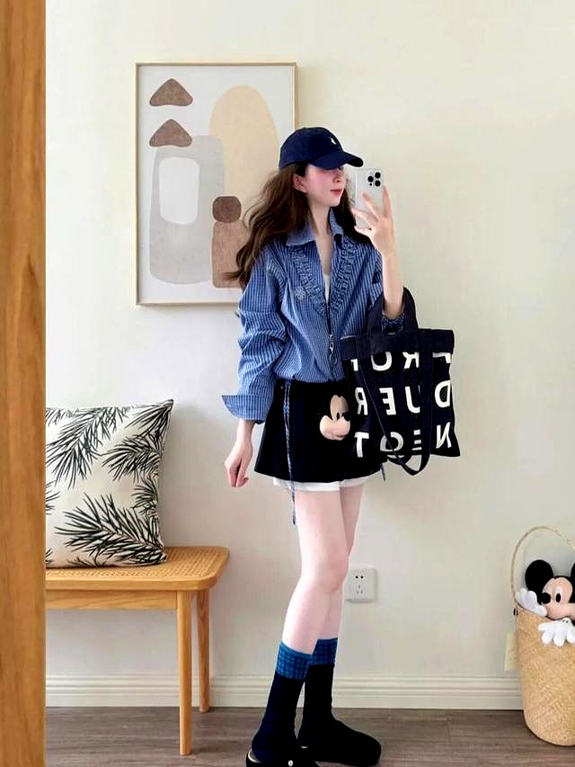 条纹衬衫当外套,A字黑裙配19块9格纹中筒袜,色卡对齐,腿被切得老长。