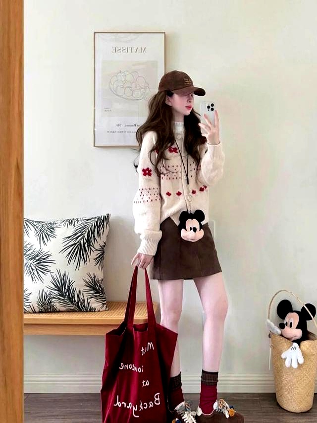 碎花被嫌老气,博主把碎花开衫配棕皮短裙,红包拎出来呼应花芯,旧包瞬间合法。