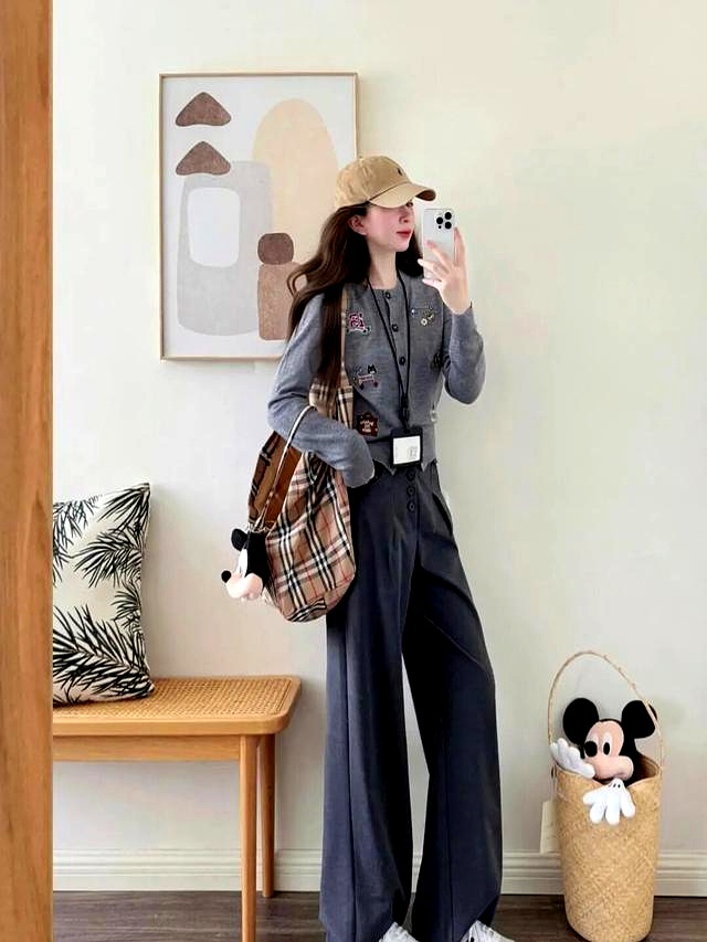 灰开衫加灰阔腿裤,一条白腰带把五五身切成三七。