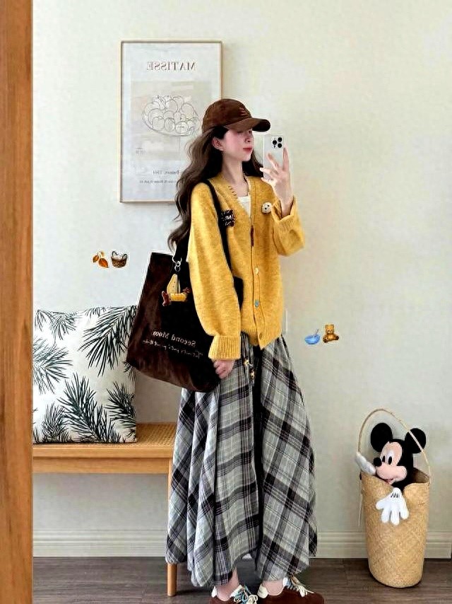 姜黄开衫加灰格长裙,把夏天白T塞进去,下摆遮胯,梨形消失。