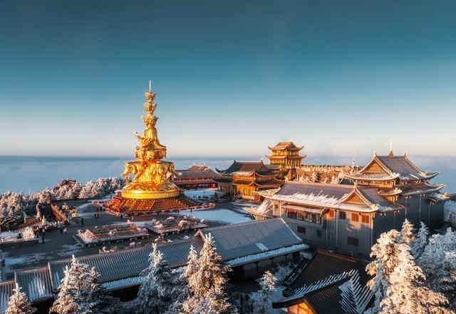 金顶那尊十方普贤像刚贴完新金,太阳一照,亮得让隔壁寺庙的和尚都戴墨镜。