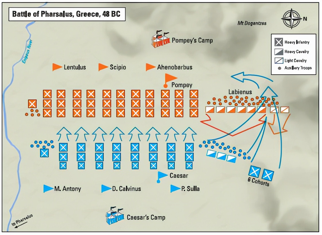 当凯撒的军团在法萨卢斯向庞培的军团发起进攻时,庞培的军团坚守阵地。通常情况下,他们会反击,但这次他们坚持了下来——这意味着他们打算站稳脚跟,讨伐凯撒的军团。凯撒的军团训练有素,他们能够意识到这一点,阻止所有 20,000 人冲锋陷阵,组成队伍并小心前进。这种纪律是非常难得的。